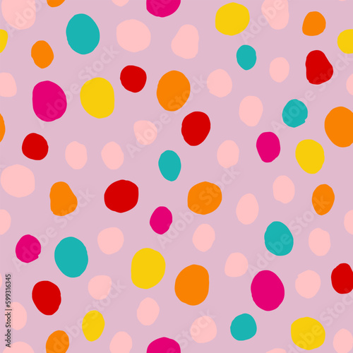 Seamless simple polka dots pattern. Colorful hand-drawn circles on Pink background. Abstract bright points ornament. Vector light illustration for baby shower, fabric, print, wrapping paper, textile