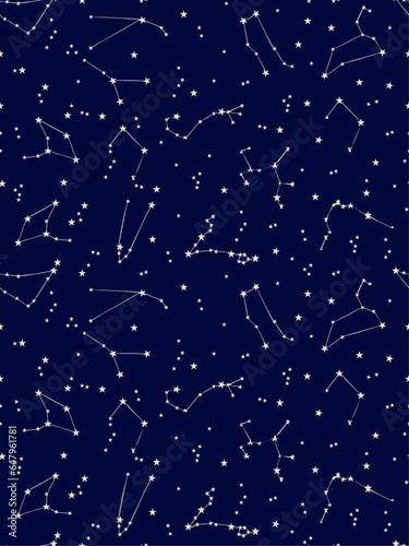 Seamless space pattern. Night starry sky with stars, constellations. navy and white background (monochrome) abstract background. Universe. Outer space. Hand-drawn vector illustration.