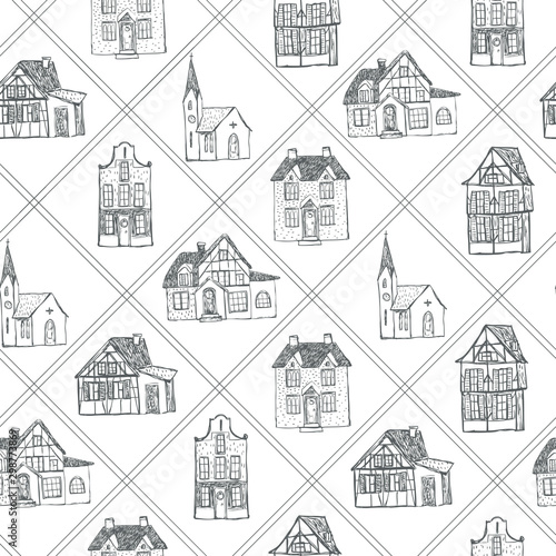 Seamless square lined Christmas pattern with black cottage, house, church on white background