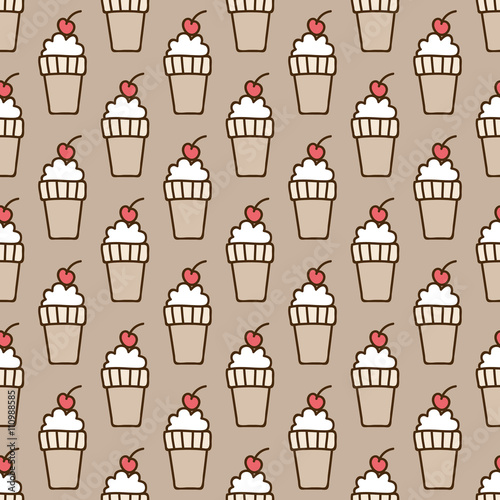 Seamless summer background. Hand drawn pattern. Suitable for fabric, greeting card, advertisement, wrapping. Bright and colorful ice-cream cone and a cherry backdrop