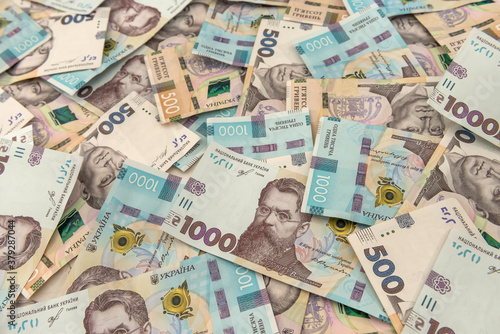 seamless texture of real new ukraine 500 and 1000 banknotes. Pile of hryvnia as financial background.