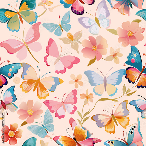 Seamless Vector Pattern of Watercolor Butterflies and Flowers in Pastel Pinks and Yellows. Perfect for: Spring festivals, garden parties, weddings