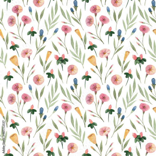 Seamless watercolor botanical pattern with spring flowers and leaves