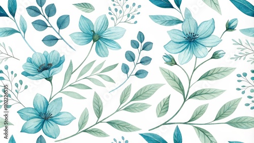 Seamless Watercolor Floral Pattern with Blue Flowers and Green Leaves, Watercolor, Floral, Pattern, Seamless, Blue, Green
