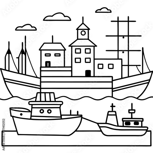 seaport, outline, colouring, book, page, line, art, drawing, vector, illustration, harbor, port, dock, ship, boat, maritime, nautical, waterfront, loading, cargo, container, crane, pier, coast, vessel, seacoast, blueprint, vignetting, coastline, docked, transportation, seascape, industry, engineering, facility, marin, graphic, design, shipyard, infrastructure
