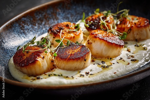 scallop, seared, cooked, food, dish, plate, epicure, seafood, eatery, meal, cookery, creamy, sauce, white, herb, thyme, garnish, delicious, dinner, elegant, presentation, closeup, roasted, plated, image, close, up, tasty