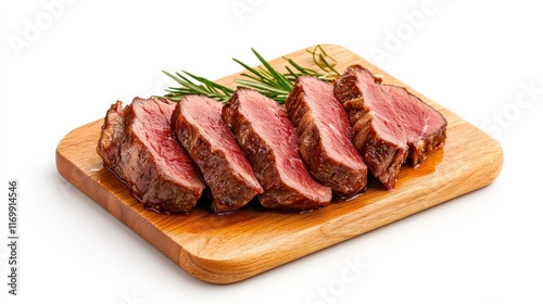 Seared Steak on Rustic Wood Cutting Board: Juicy, medium-rare steak slices, glistening with savory juices, are arranged on a rustic wooden cutting board, garnished with sprigs of fresh rosemary.