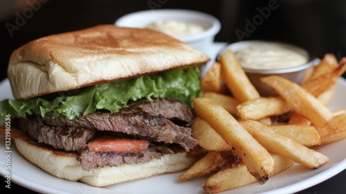 Seared steak sandwich with herbed butter and roasted garlic aioli, served with fries.