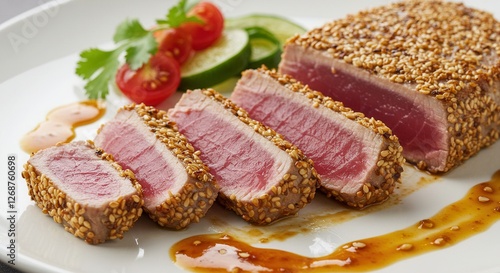 tuna, steak, seared, sliced, sesame, seed, rare, fish, dish, plate, presentation, cookery, epicure, meal, food, tomatoes, cucumber, cilantro, vegetable, sauce, side dish, ingredient, raw, healthy, eating, nourishment, eatery, cooking, food photography, seafood, fish dish, protein, delicacy, fresh, culinary, fine dining, white plate, light, studio shot, still life