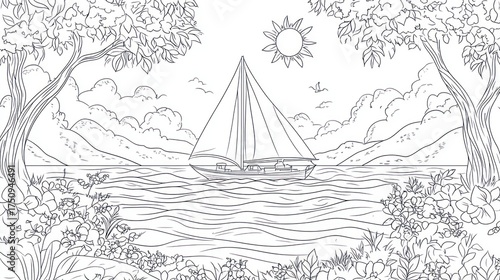 sailboat, sea, landscape, nature, tree, sun, cloud, tranquil, colouring, page, illustration, drawing, boat, water, ocean, scenery, scenic, summer, peaceful, calm, art, black, white, line, vignetting, design, vintage, garden, flower, plant, mountain, horizon, sky, bird, sailing, relax, graphic, style, monochrome, printable, adult, children