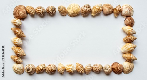Seashell Frame Border White Background - Summer, beach, vacation, ocean, nature. Seashells arranged in a rectangular frame on a white background