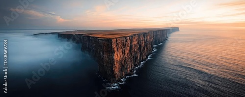 Seaside cliffs landscapes idea. A breathtaking cliff overlooking the ocean at sunset, shrouded in mist and serenity.
