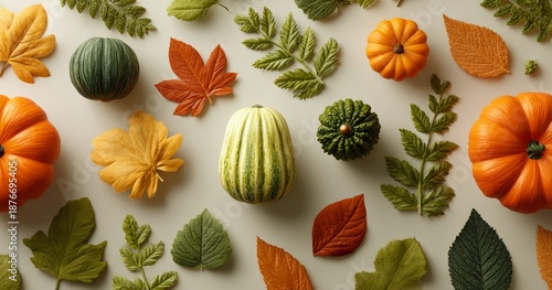 seasonal, element, three-dimensional, render, top, view, flat, lay, clean, autumn, colours, pumpkin, squash, leaf, foliage, nature, harvest, decoration, arrangement, pattern, texture, organic, bright, orange, green, minimalist, detail, background, design