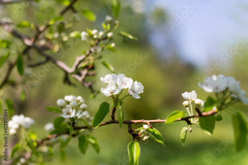 Seasonal flowering of apple, cherry. Spring trees. Close shot of cherry blossom, apple tree, tree branch. Blurred background. Macro shooting