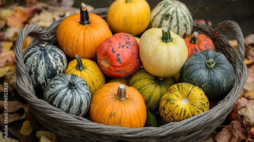 pumpkin, gourd, vegetable, basket, autumn, harvest, seasonal, colourful, squash, nature, decor, food, fresh, garden, fall, variety, organic, agriculture, farming, presentation, table, healthy, cooking, display, collection, round, striped, orange, yellow, green, decoration, rustic, natural, picking