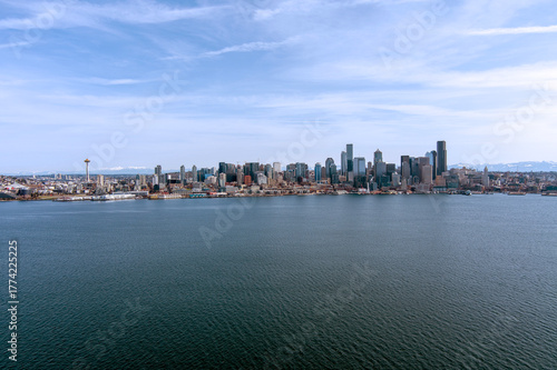 seattle, june, summer, sunny, puget sound, outdoors, us, city, landscape, horizon, skyscraper, space needle, city landscape, urban, town, travel, architecture, aerial view, building, ferry, ship, mountain, tour tourism, waterfront, port, harbor, downtown, bay, sea, cascade, sky, scenic, travel destination, america, northwest, city life, drone, blue skies, march, boat