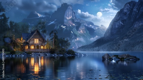 cabin, lake, mountain, moon, night, forest, water, tree, sky, nature, landscape, serenity, peace, calmness, wood, calm, mist, fog, dark, blue, light, illuminated, still, peaceful, magical, enchanted, dreamy, remote, isolated, wild, natural, rustic, cosy, home, window, bungalow, hidden, adventure, get-away, escape, solitude, quiet, beauty, idylli