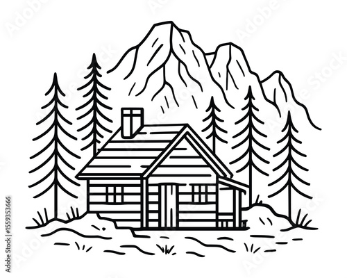 Secluded Cabin in the Forest with Mountain View in Line Art Style Illustration