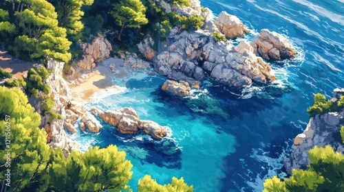 Secluded cove, aerial view, turquoise water, sunlit beach, travel brochure