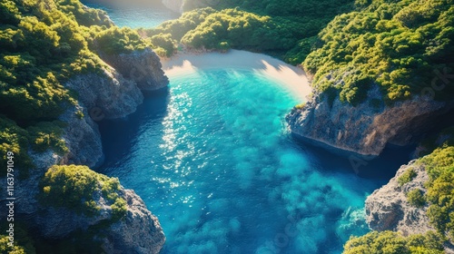 beach, cove, ocean, sea, water, sand, tropical, island, paradise, summer, vacation, travel, holiday, sun, sunlight, nature, landscape, scenery, coast, shore, cliff, rock, greenery, tree, foliage, plant, blue, turquoise, white, aerial, view, overhead, hidden, secluded, calm, serene, peaceful, tranquil, exotic, beautiful, stunning, pristine, untouched, clear, vibrant, bright, idylli, get-away, escape