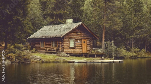 Secluded lakeside log cabin, forest backdrop, tranquil escape