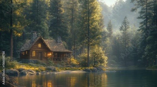 cabin, lake, forest, tree, wood, nature, log, home, river, water, sun, light, morning, peaceful, serene, calmness, calm, quiet, remote, secluded, wilderness, escape, rustic, cosy, idylli, scenic, landscape, outdoors, summer, autumn