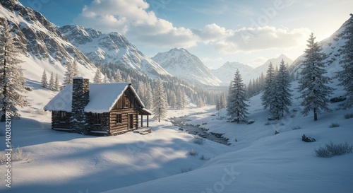 Secluded Winter Cabin in Mountain Valley - A cozy log cabin nestled in a snowy mountain valley, bathed in sunlight. Perfect for winter wonderland themes