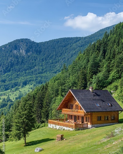 house, chalet, cabin, home, mountain, mountain, vale, tree, forest, wood, nature, landscape, scenery, view, rural, countryside, green, grass, hill, hilltop, wood, timber, architecture, building, summer, sunny, day, sky, blue, cloud, tranquil, peaceful, serene, idylli, picturesque, beautiful, scenic, travel, vacation, get-away, escape, relaxation, calm, quiet, solitude, remote, isolated, wilderness