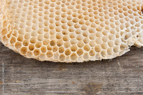 Section of wax honeycomb from beehive on the vintage wooden background. .