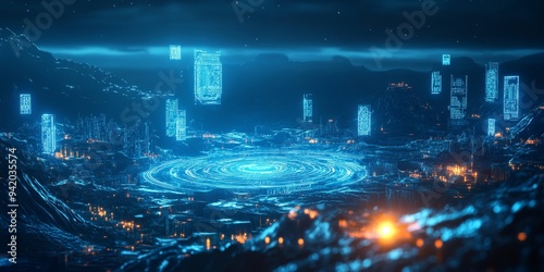 Secure digital zone glowing with neon blue light, protected by intricate security patterns, set against a dark futuristic landscape