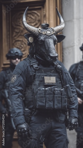 Security personnel in unique bull mask stands guard outside a building during a covert operation in an urban setting