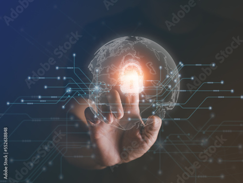Security technology concepts, hand and fingerprint virtual scan to lock or unlock security information network system. Connection with high security technology, firewall and online privacy.