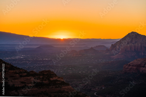 Sedona, Arizona Red Rock Landscape at Sunset with Sunburst. A wide vista of desert mountains, canyons, and the town under a dramatic orange and purple sky.