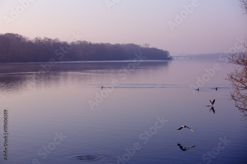 see, winter, hazy, foggy, bird, fly, sunset, reflex, contemplation, blueish, cold, morning, water, countryside, nature, flux, shore, tree, panorama, peaceful, calm, evening