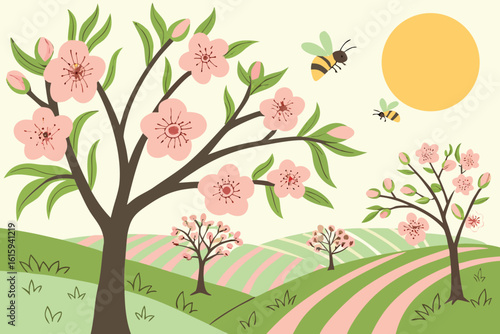 See the blooming orchards in the Netherlands during spring with bees, flowers, and sunshine in modern flat illustration style.