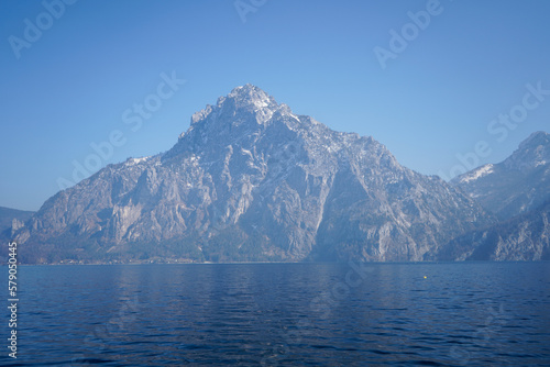 Seebrücke, Aueck, Traunkirchen, Austria - March 2023: Beautiful city view. Mountain Lake. Lake among the mountains. Huts in the mountains near the forest lake.