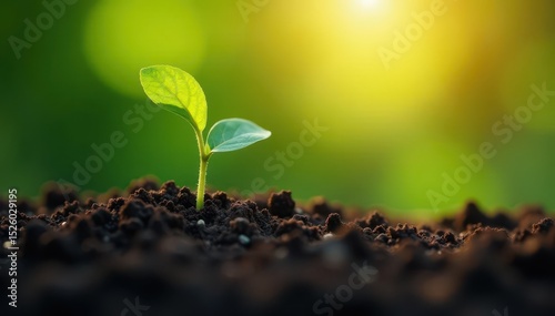 Seedling emerges from soil, sunlight illuminates leaves, vibrant, macro shot, natural