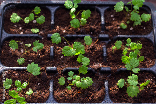 Seedlings on the windowsill. strawberry seedlings, close-up