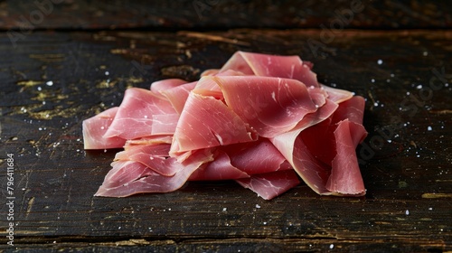 Selection of delicately sliced cured ham on vintage wooden table for gourmet presentation