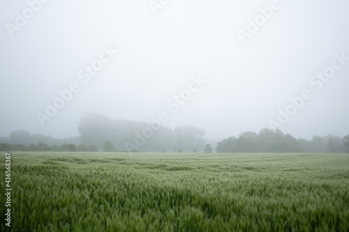 Selective focus and outdoor misty landscape view fog over grass, rice, meadow, wheat or barley agricultural field. Natural greenery green background. Growth rice field.