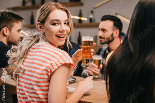selective focus of cheerful young woman smiling at camera while holding glass of light beer