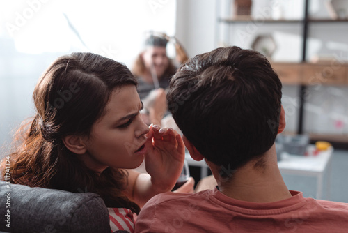 leisure, activity, fun, entertainment, beautiful, girl, caucasian, friendship, european, man, emotion, home, woman, talk, emotional, together, togetherness, friends, indoor, attractive, whisper, gossip, guy, selective focus, young adult, backview, three people