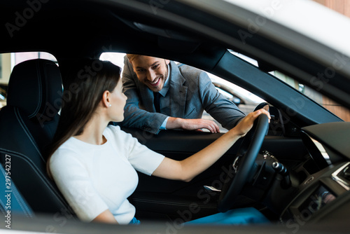 selective focus of smiling woman sitting in car near bearded man in car showroom