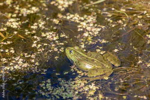 Selective focus of the marsh frog in swamp in its natural habitat, Pelophylax ridibundus is the largest frog native to Europe and belongs to the family of true frogs, Netherlands.