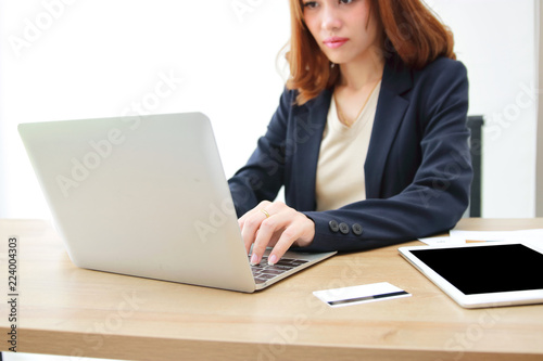 Selective focus on hands of attractive Asian business woman working with laptop in office.