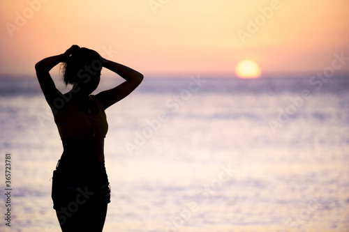 (Selective focus) Stunning view of the silhouette of a girl walking on a beach during a beautiful and romantic sunset. Siargao Island, Philippines.