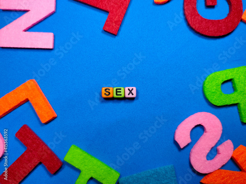 Selective focus.Colorful dice with word SEX on blue background.Shot were noise and film grain.