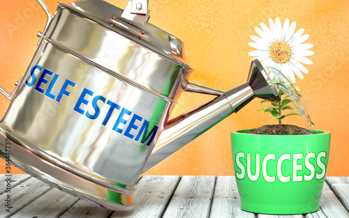 Self esteem helps achieve success - pictured as word Self esteem on a watering can to show that it makes success to grow and it is essential for profit in life, 3d illustration