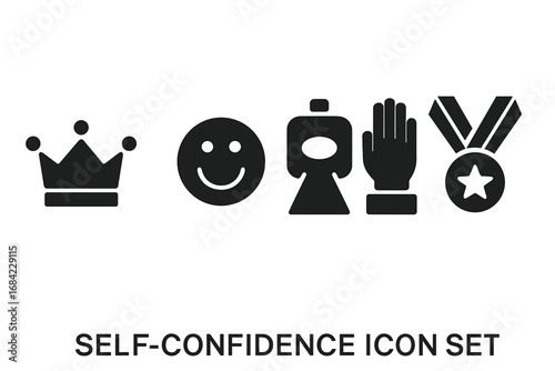 Self-confidence icon set with crown, smiley face, spotlight, raised hand, medal symbols, solid filled vector illustration, bold empowerment, achievement, positivity design