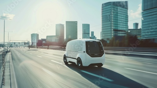 van, autonomous, vehicle, city, urban, driving, technology, future, transportation, modern, street, road, highway, traffic, city landscape, building, skyscraper, horizon, white, clean, futuristic, innovation, mobility, progress, smart, electric, car, truck, delivery, logistic, speed, motion, blur, sun, daytime, bright, sunlight, day